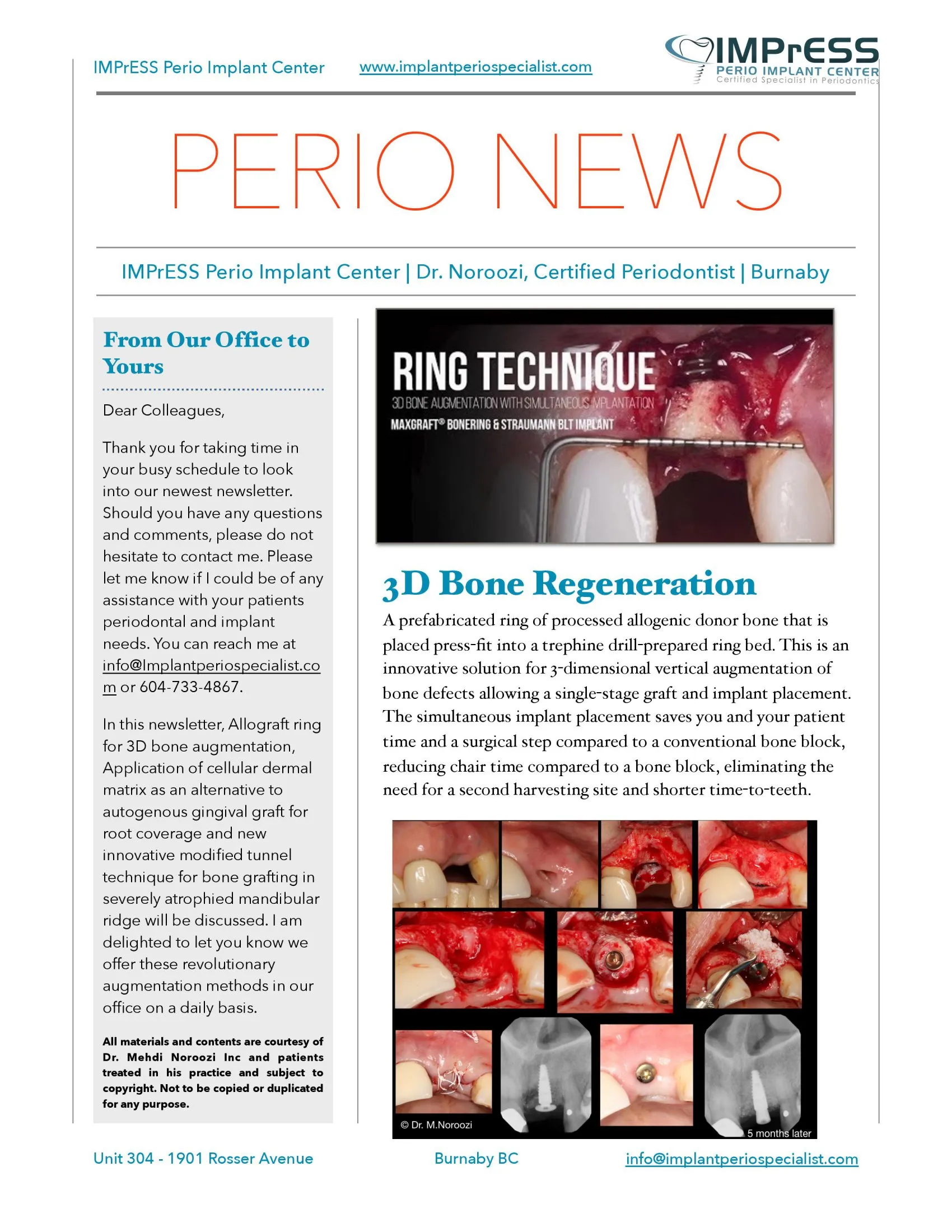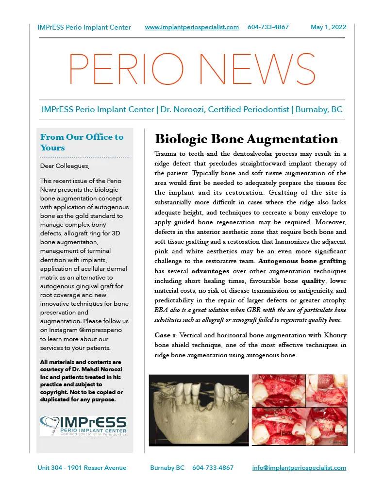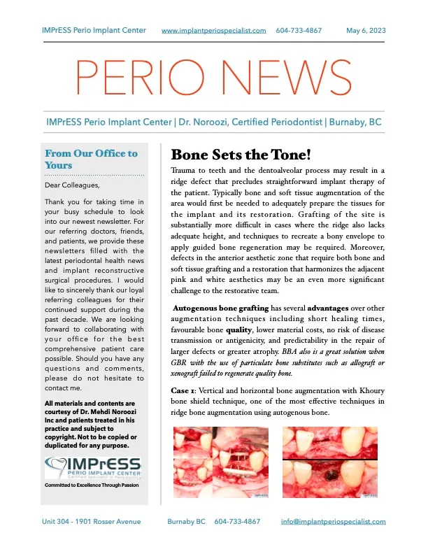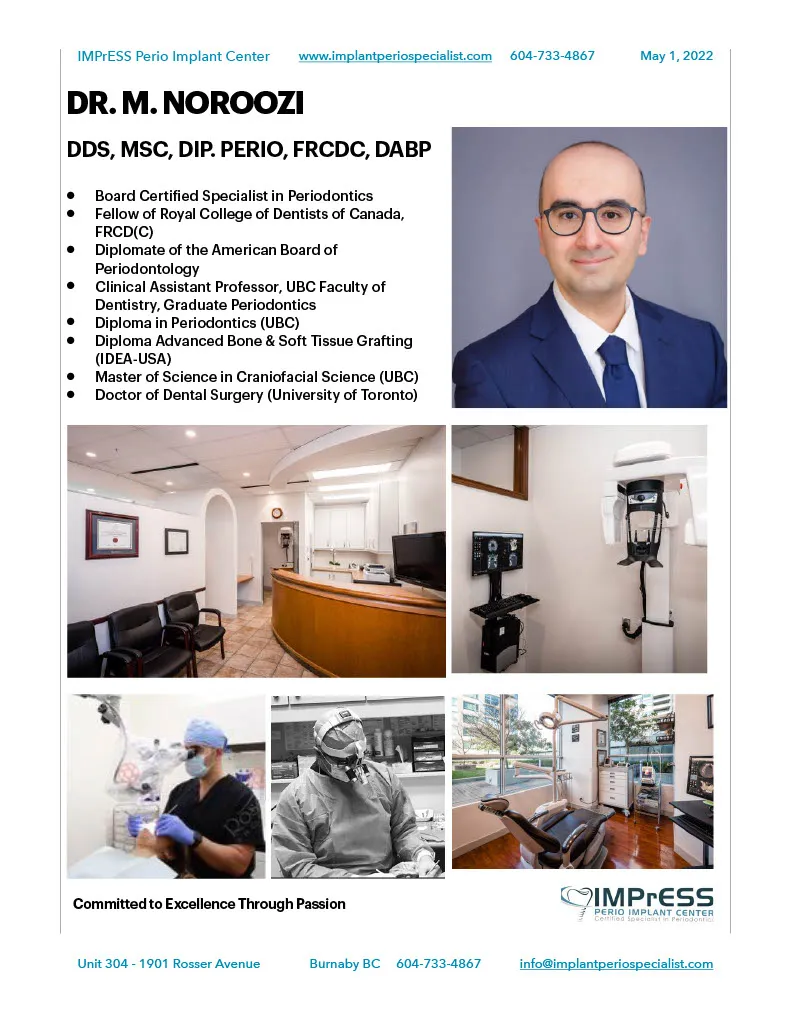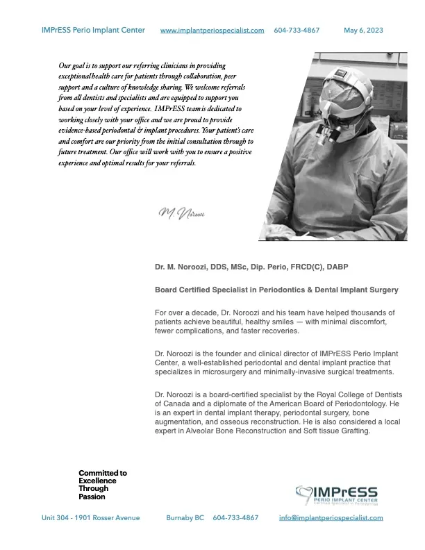 For nearly two decades, Dr. Noroozi and his dedicated team have transformed the smiles of thousands of patients, delivering exceptional results with minimal discomfort, fewer complications, and quicker recovery times. As the founder and clinical director of IMPrESS Perio Implant Center, Dr. Noroozi leads a renowned practice specializing in advanced microsurgery and minimally invasive periodontal and dental implant procedures.