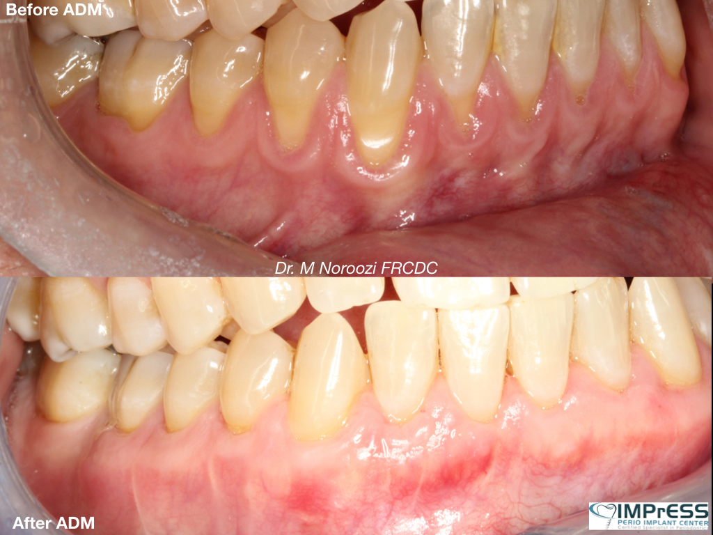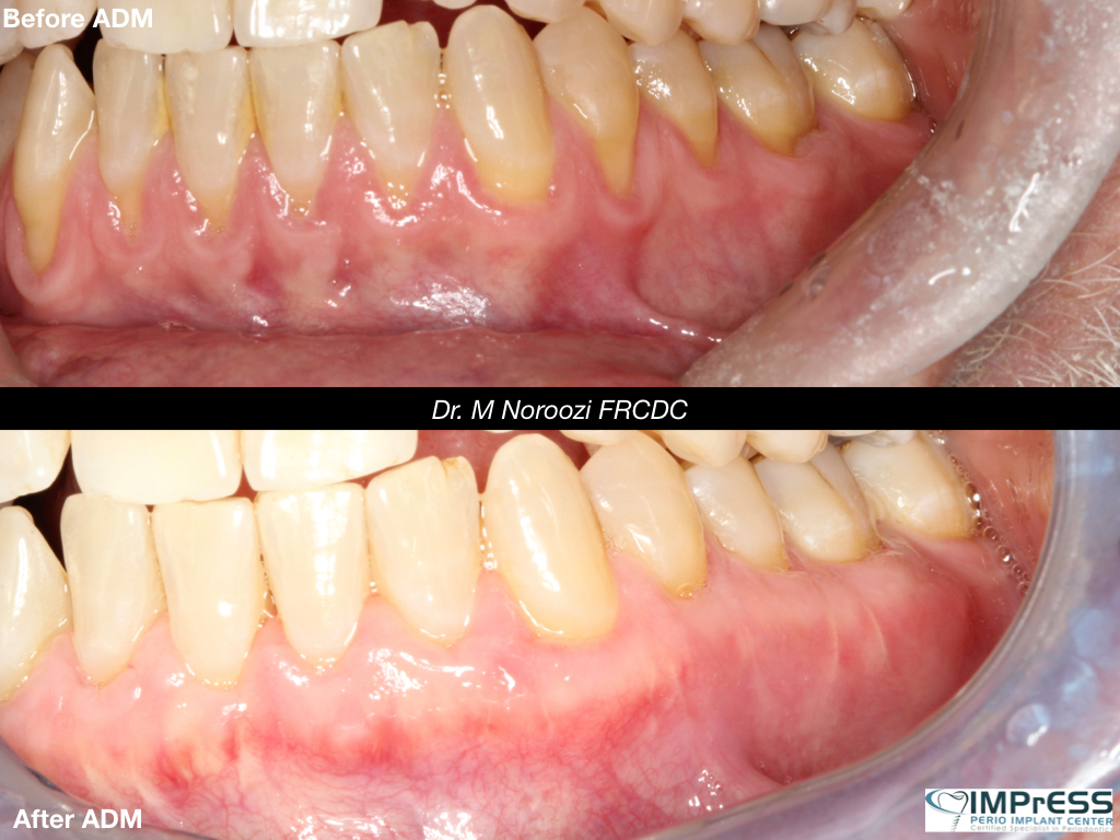 Acellular dermal matrix allograft – This procedure uses medically processed, donated human tissue as a tissue source for the graft. The advantage of this is procedure is that there is no need for a donor site from the patient’s palate (and thus, less pain).