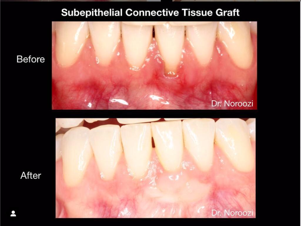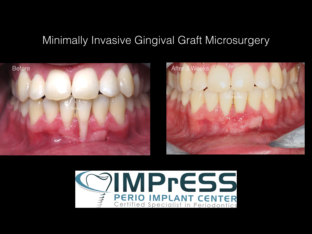 Gum recession occurs when your tooth root becomes exposed and may be a sign of gum disease, which destroys the structures that support your teeth. Dr. Noroozi has helped his patients treat gum tissue loss due to periodontal disease. His restorative procedures help patients regenerate essential gum tissue needed to support and protect the teeth, covering roots exposed by gum recession.